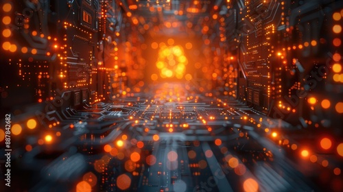 Futuristic digital network with glowing orange lights and intricate circuitry, representing advanced technology and data communication.