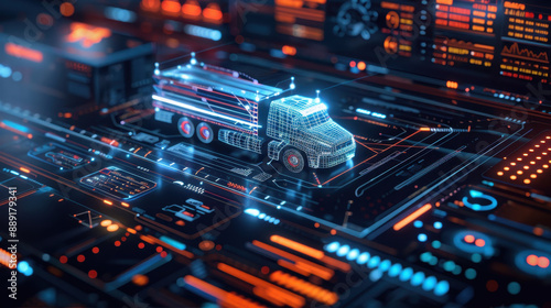 Futuristic digital screen with wireframe truck model, high-tech interface, and neon lights in dark setting