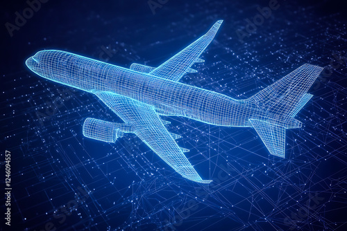 Futuristic Digital Wireframe Airplane Concept on Blue Background