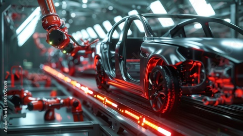 Futuristic electric car automated robot arm assembly line manufacturing hyper realistic