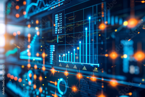 Futuristic financial data display with glowing blue and orange light