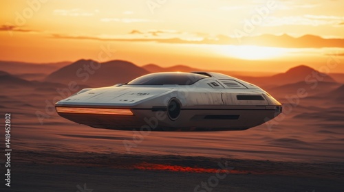 Futuristic flying vehicle hovering over a desert landscape at sunset with glowing accents