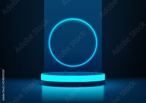 futuristic glowing blue circle on dark background, centered on a round platform modern technology concept, minimalist design, tech showcase