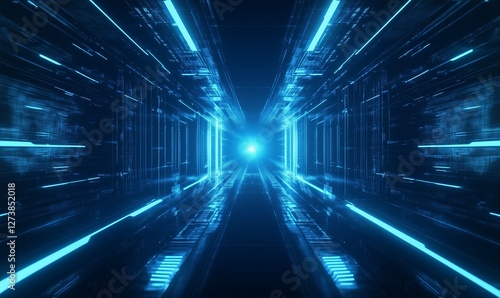 Futuristic glowing blue digital corridor with neon light reflections, symbolizing cyberspace, virtual reality, and high tech innovation