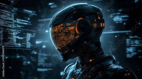 Futuristic helmeted figure with a glowing digital interface against a high-tech background.