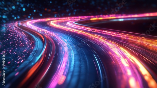 Futuristic Highway with Glowing Light Trails and Bokeh Effects in Dark Backdrop