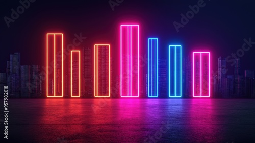 Futuristic Holographic Investment Portfolio in Neon City Skyline with Copy Space, Selective Focus. Ultra HD Quality.