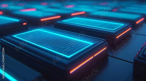 Futuristic image of glowing battery packs with blue and red accents, representing advanced technology and energy solutions.