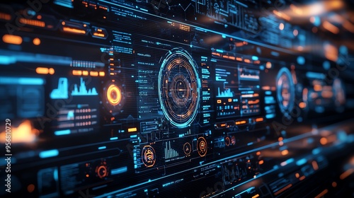 Futuristic interface with glowing elements displaying data and metrics, ideal for technology, science, and innovation themes.