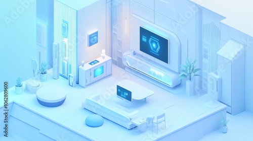 Futuristic isometric illustration of a smart home with digital interfaces and a VR headset.