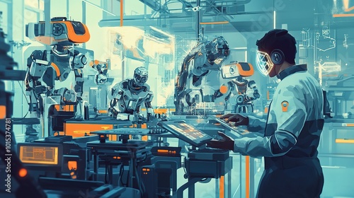 Futuristic lab with robots and a technician.