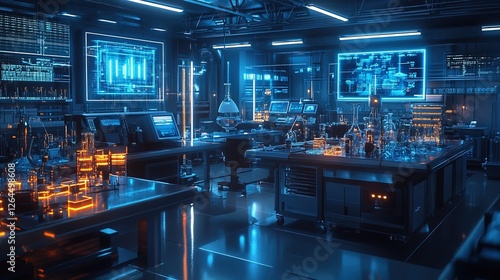 Futuristic laboratory filled with glowing equipment and holograms