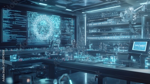 Futuristic Laboratory with Data Network Visualization and Robotic Arm