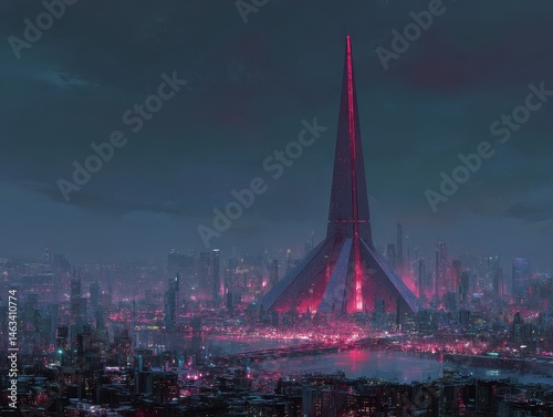 Futuristic metropolis illuminated by vibrant lights.