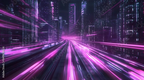 Futuristic neon cityscape with light trails depicting modern urban development photo