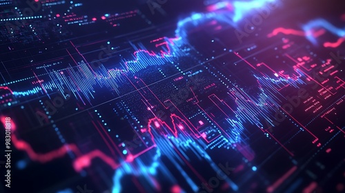 Futuristic Neon Data Visualization: Dynamic Financial Analytics and Technological Insights with Glowing Abstract Grid Patterns