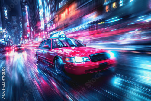 Futuristic neon-lit city, speeding taxi, motion blur, night, vibrant urban scene, cyberpunk style