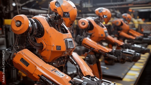Futuristic Orange Robots on Assembly Line in Modern Factory Setting
