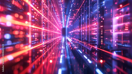 Futuristic perspective of a cyber data center with glowing red and blue lines symbolizing network connectivity.