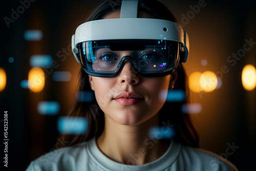 Futuristic portrait of a woman wearing a VR headset with a digital interface. AI generated