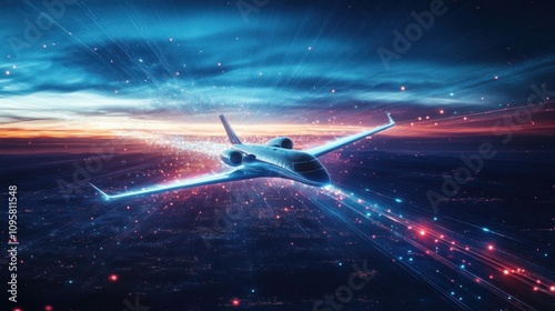 Futuristic private jet flying through vibrant light trails at night.