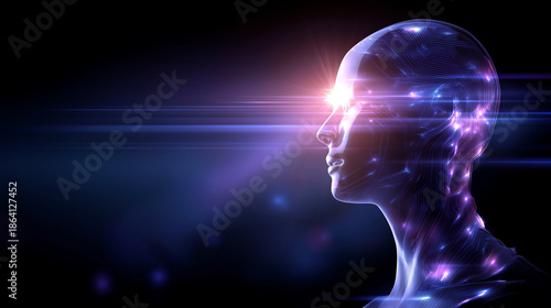 Futuristic robot face profile with glowing eyes, digital transformation concept, artificial intelligence, faceless, with copy space