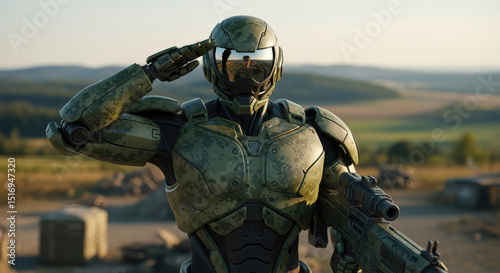 Futuristic Robotic Soldier Saluting on the Battlefield