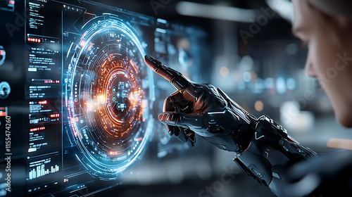 Futuristic robotics interaction high-tech lab digital display cyber environment close-up viewpoint innovation concept