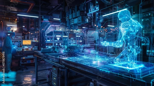 futuristic robotics lab where engineers are working on advanced robotic systems using holographic simulations