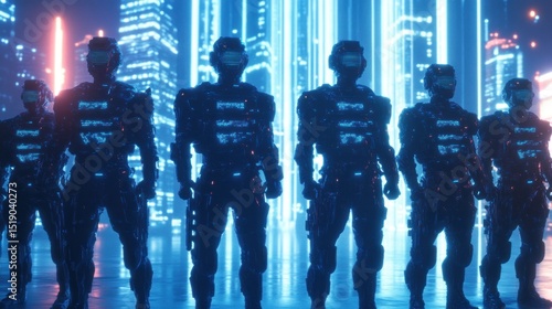 Futuristic security team in neon city. Cyber soldiers stand guard in a vibrant, digital urban environment. High-tech armor and glowing light displays reflect a futuristic vision of urban protection