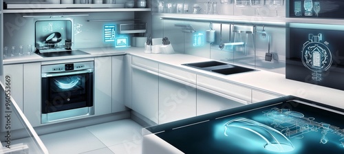 Futuristic Smart Kitchen with High-Tech Dishwashing Machine and Connected Home Hub Interface