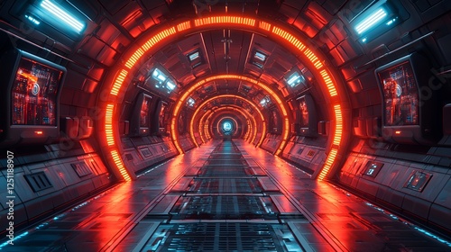 Futuristic spaceship corridor, red lights, technology, journey, science fiction