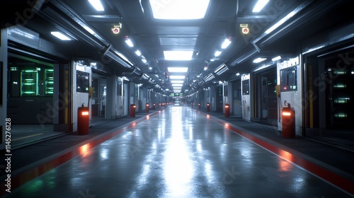 Futuristic spaceship corridor with glowing lights and metallic doors.