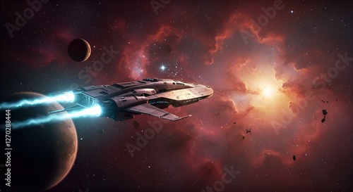 Futuristic spaceship flying through a vibrant galaxy filled with stars, planets, and glowing nebulae.