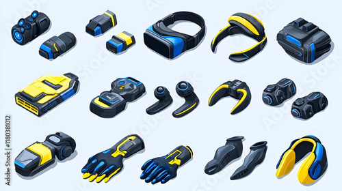 Futuristic tech wearables isometric collection, diverse virtual reality gadgets, digital devices against a light background.