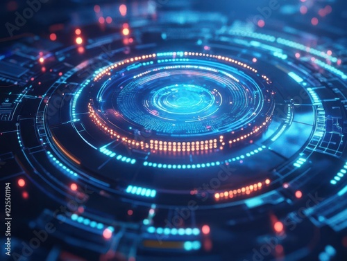 futuristic technology interface with glowing circuit patterns, holographic displays, blue digital aesthetics