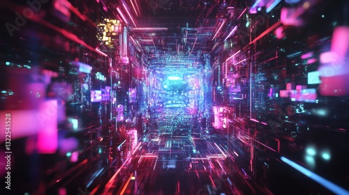 Futuristic Technology Tunnel with Neon Lights and Digital Data Flow