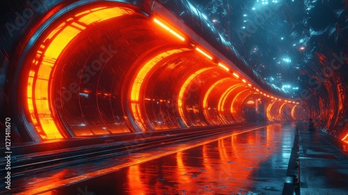 Futuristic tunnel, neon lights, city backdrop, transport
