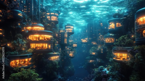 Futuristic underwater city, with glowing buildings and bio-luminescent sea life