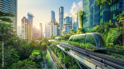 Futuristic urban landscape with eco-friendly transportation and green architecture, showcasing sustainable city living.