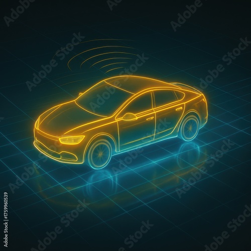 Futuristic vehicle with sensor technology, glowing on a blue grid backdrop.