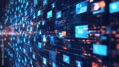 Futuristic Virtual Conference with Glowing Digital Screens Showcasing Remote and Connectivity