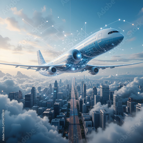 Futuristic Visualization of an Airliner with Digital Network Connectivity Over a Smart Cityscape, Symbolizing Advanced Air Travel Technology