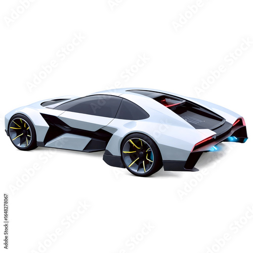 Futuristic white concept car with sharp angles and blue rear lighting, viewed from the rear quarter.