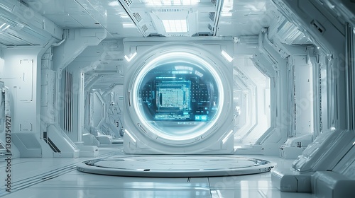 Futuristic white interior with a large display screen in the center