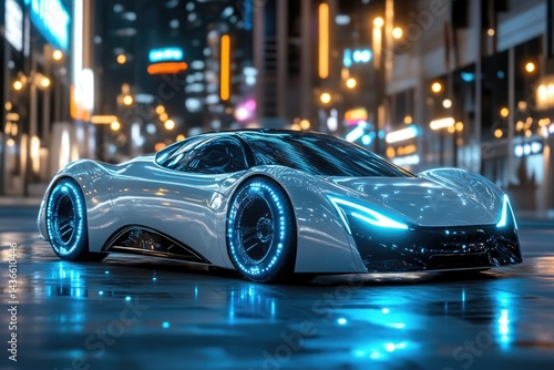 Futuristic white sports car with illuminated wheels parked on a city street at night.