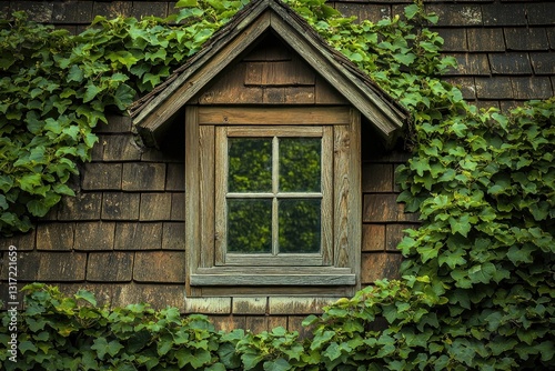 Gable window surrounded by ivy, set in a shingled wall under a roof