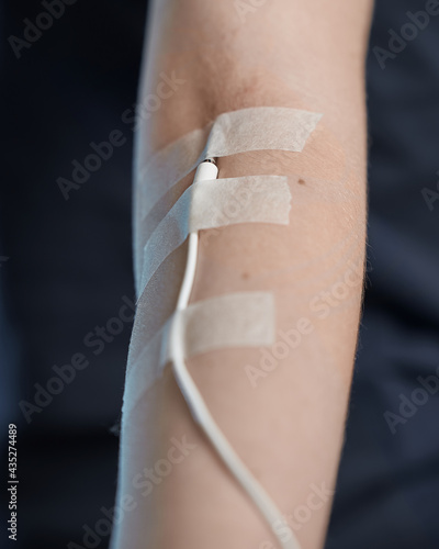 Gadget-dependent. The white wire is taped to the arm like an IV.
