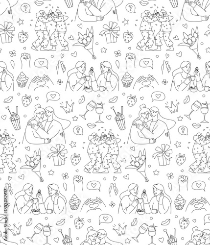 Galentines Day Seamless Pattern, Women Friendship Line Art Vector Illustration