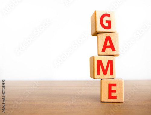 Game symbol. Concept word Game on beautiful wooden blocks. Beautiful wooden table white background. Business, lifestyle and game concept. Copy space.